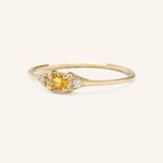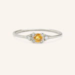 Petite, yet robustly sparkling, this ring features a citrine center stone. A modern take on a classic three stone ring, this piece is timeless in its design but only made better with a beautiful accent diamond on each side. Beautiful enough to be worn solo as a subtle accent or stacked with other rings.