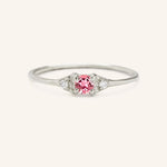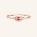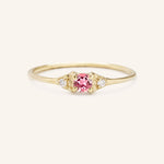 Petite, yet robustly sparkling, this ring features a pink tourmaline center stone. A modern take on a classic three stone ring, this piece is timeless in its design but only made better with a beautiful accent diamond on each side. Beautiful enough to be worn solo as a subtle accent or stacked with other rings.