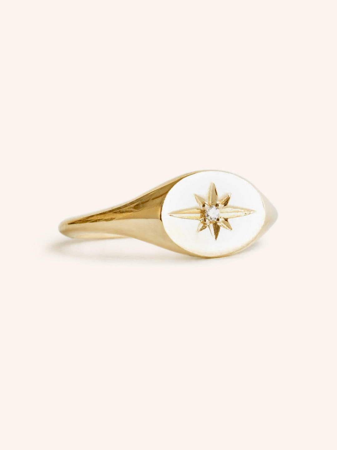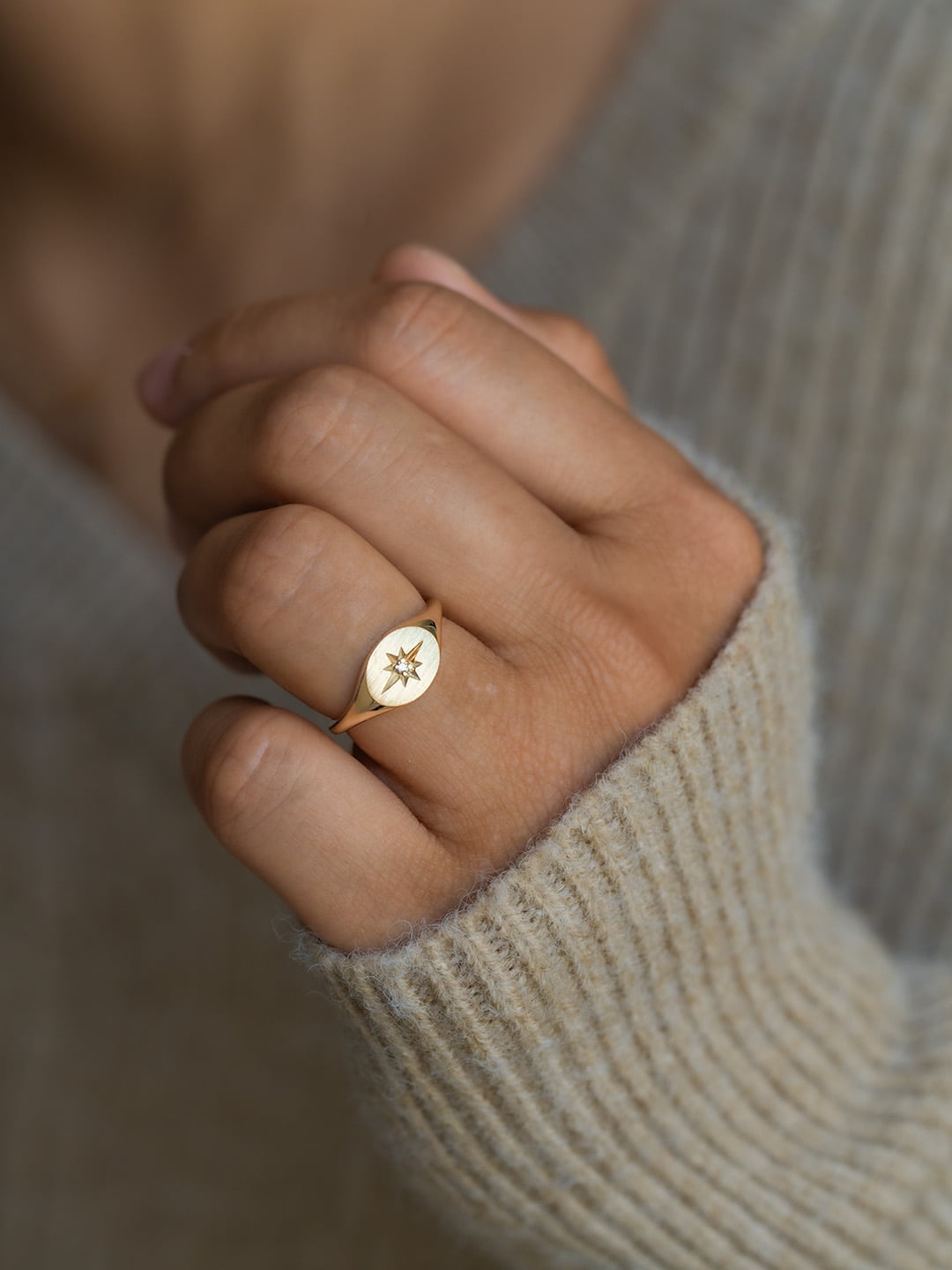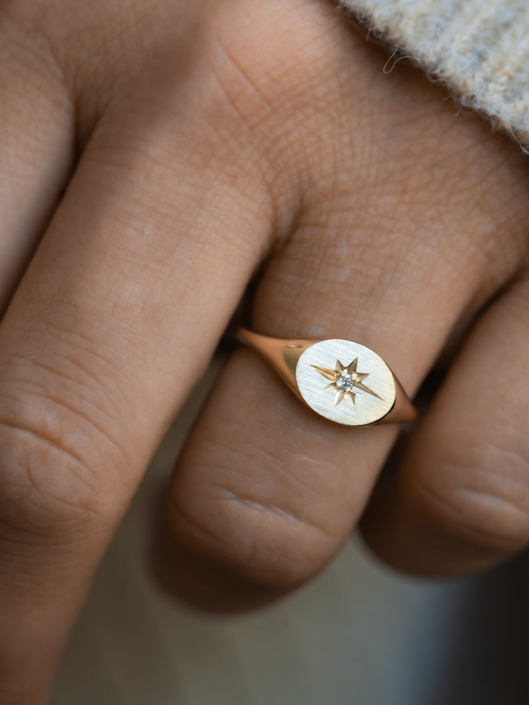 Elevate your everyday style with our Diamond Starburst Signet Ring. This exquisite piece features a sparkling diamond accent, adding a touch of glamour to any outfit.