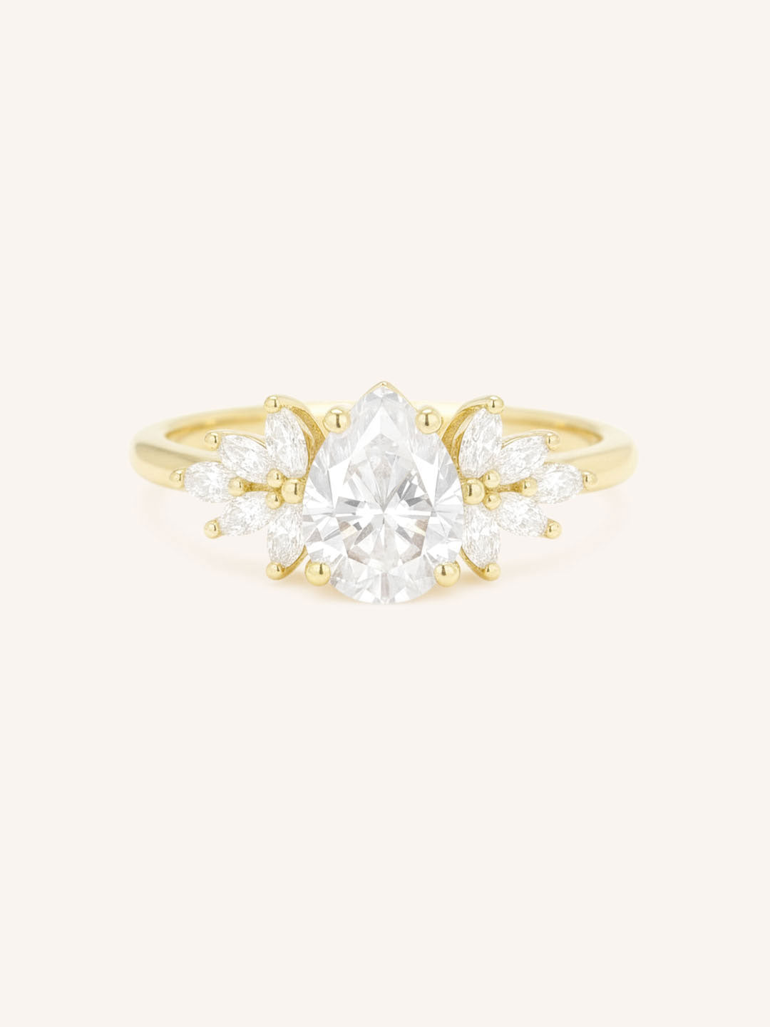 Discover a classic engagement ring with a modern twist. This stunning ring features a brilliant pear cut moissanite at the center, set in a cluster style with marquise moissanites adorning each side. The cluster design of this ring is both timeless and contemporary, making it a perfect choice for any bride. Made with durable and ethically sourced moissanite stones, this ring is the perfect symbol of your commitment. Express your love with this exquisite ring and start your forever journey in style.