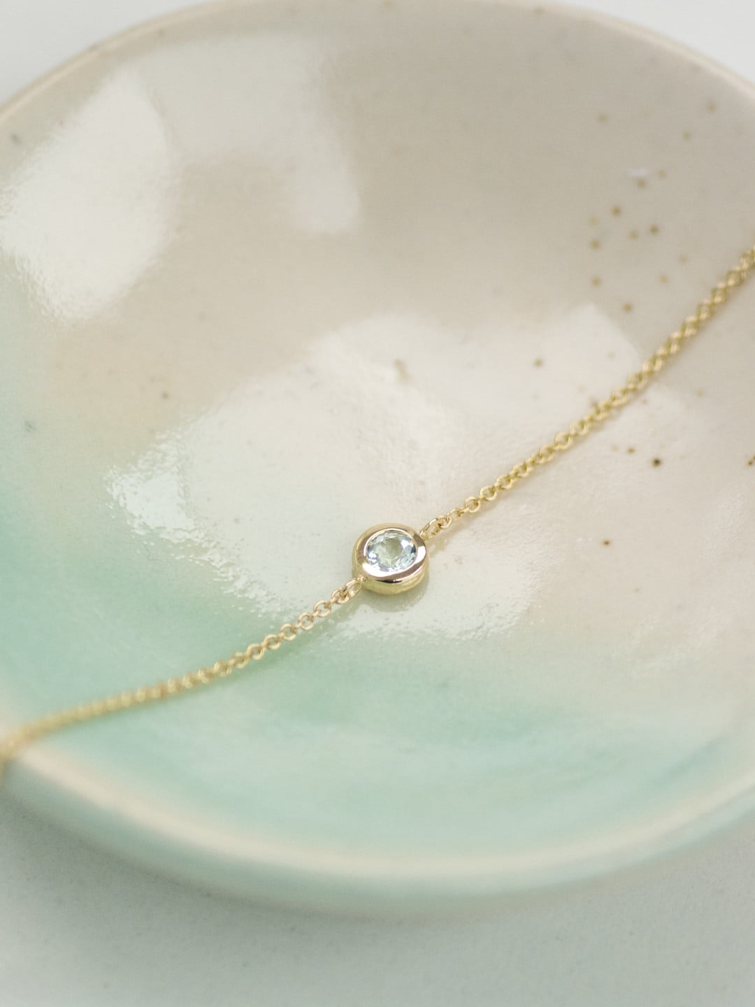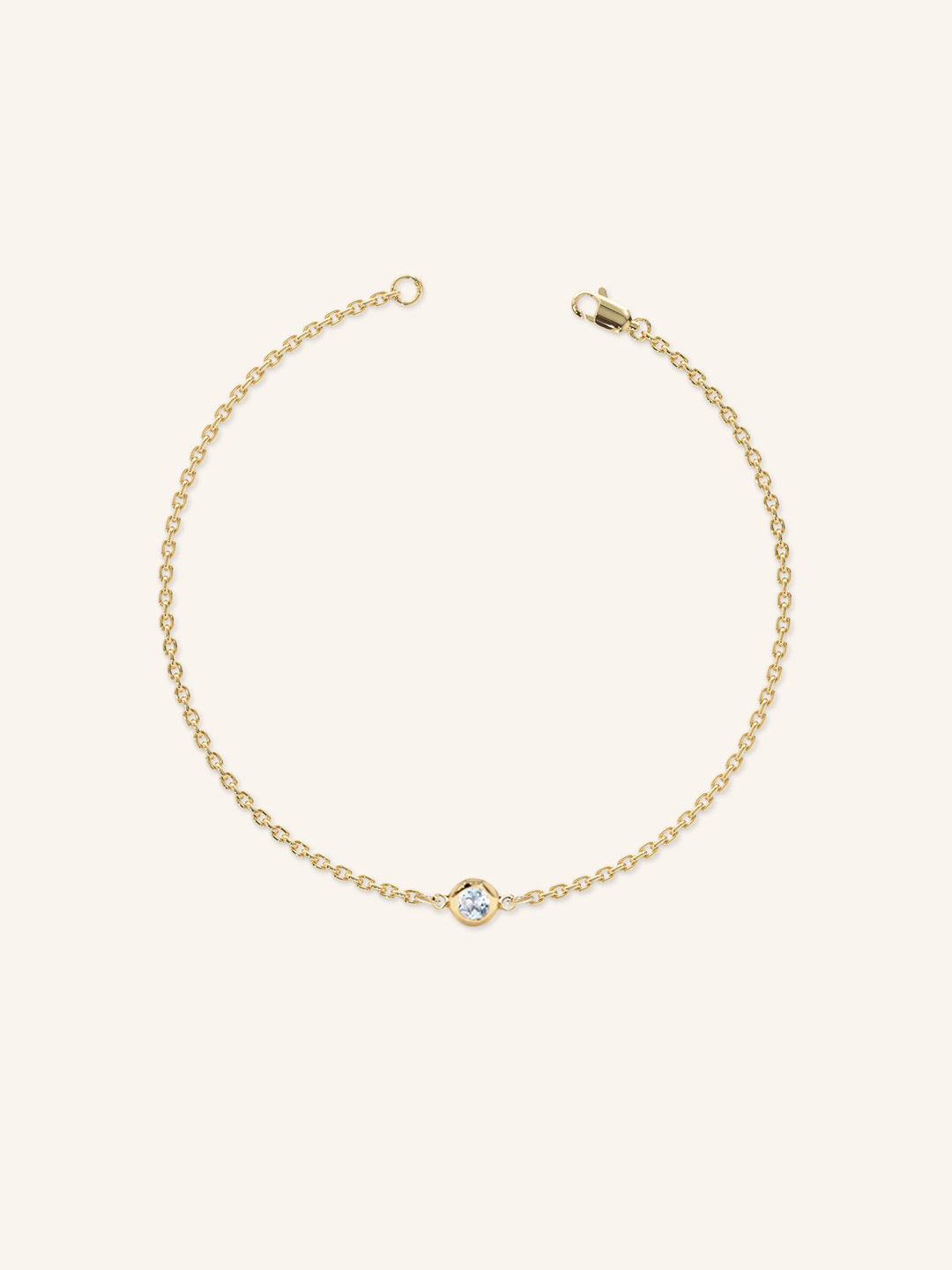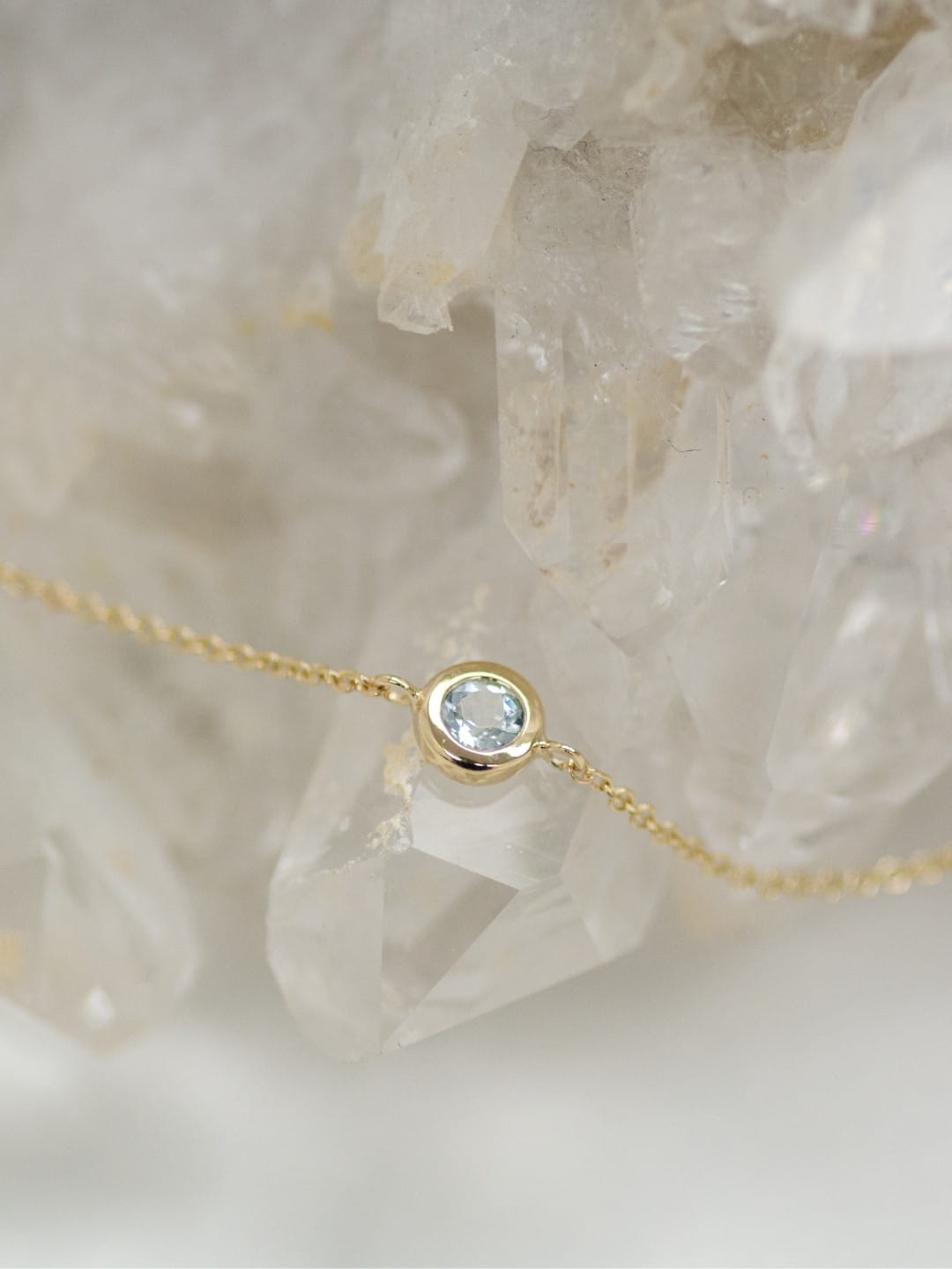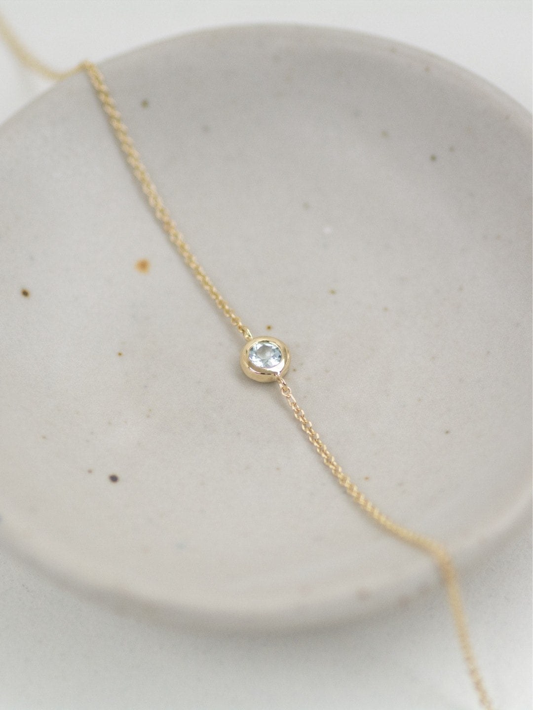 Breathe in the beauty of fall with this beautiful, dainty bracelet that's perfect for everyday wear. This simple piece is crafted from 14K gold, featuring a center stone of your choice. The bezel setting captures the beauty of your chosen stone making this piece perfect for stacking.