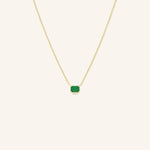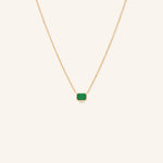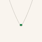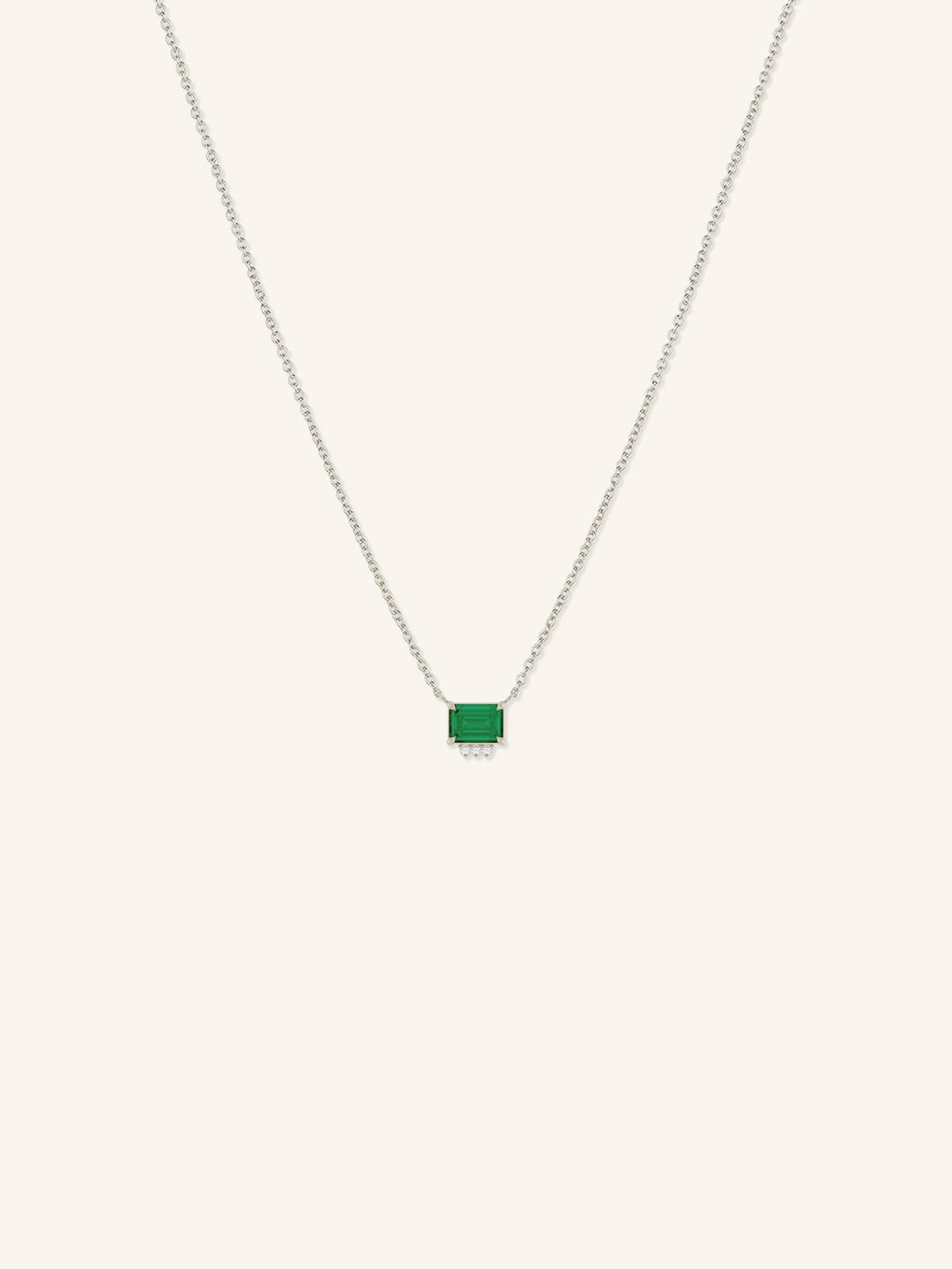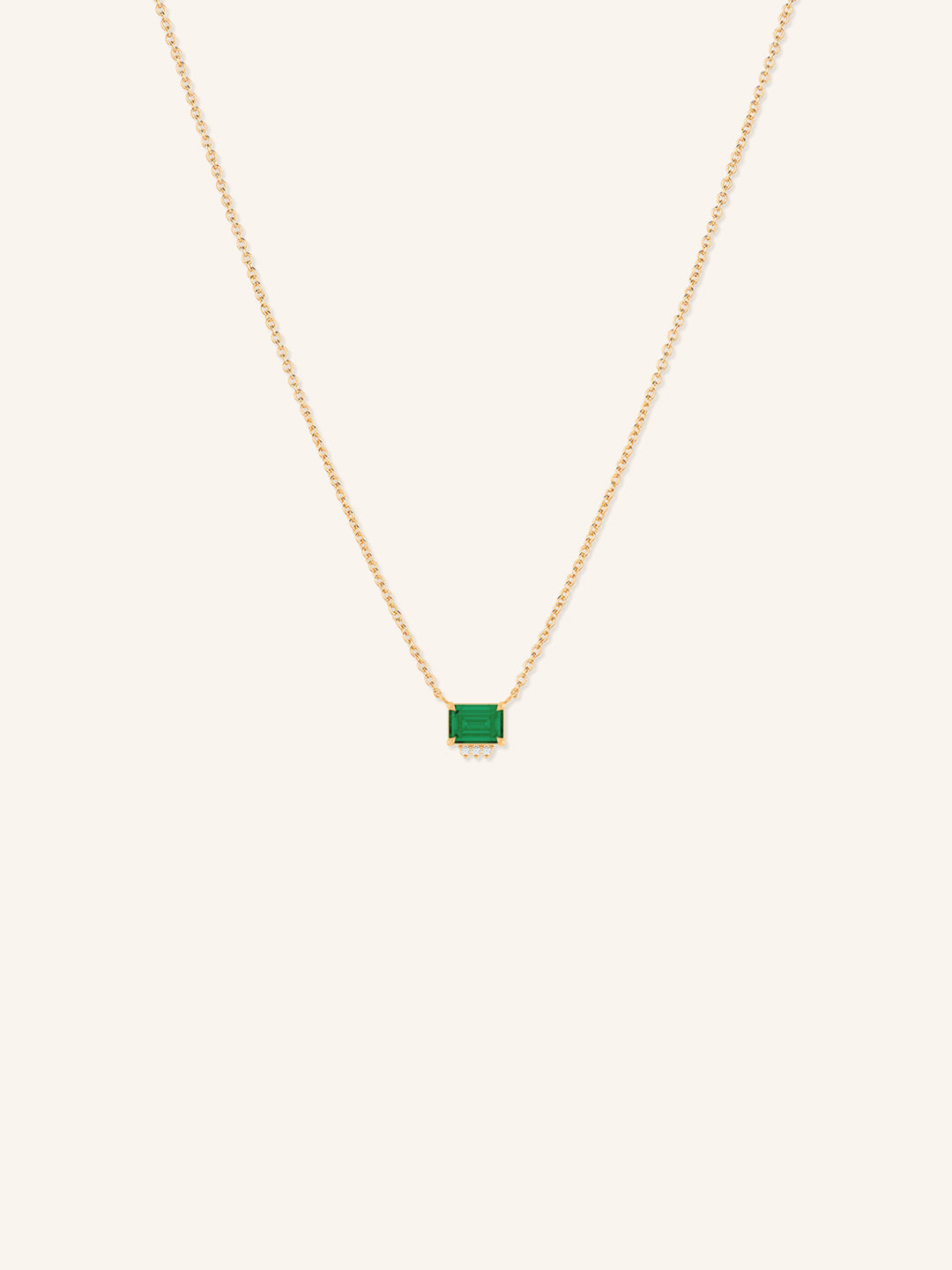 The Grattan Gemstone Accented Diamond Necklace features a stunning emerald-cut gemstone, elegantly complemented by three delicate accent diamonds at the bottom. This simple yet sophisticated design adds a touch of sparkle and color, making it a timeless piece for any occasion.