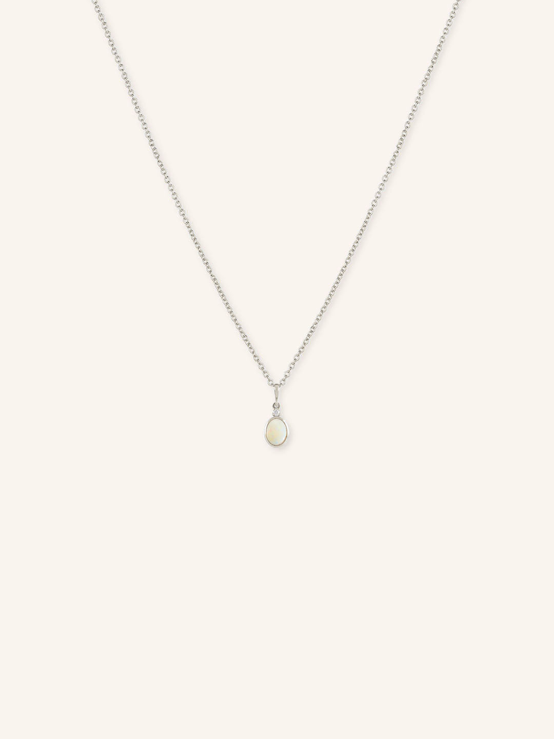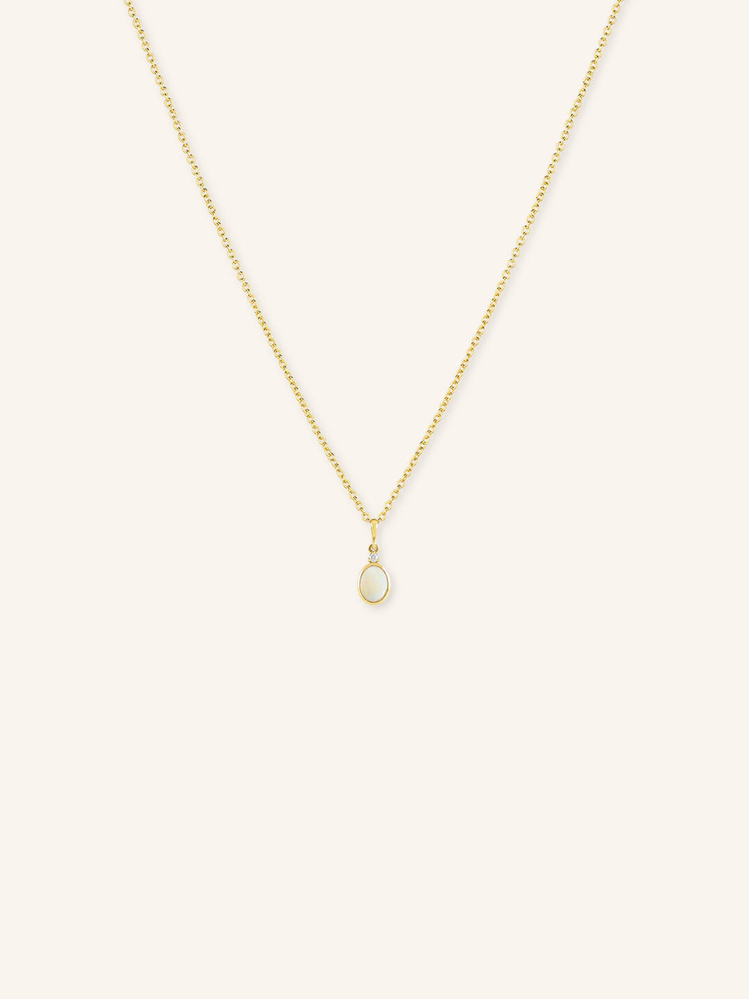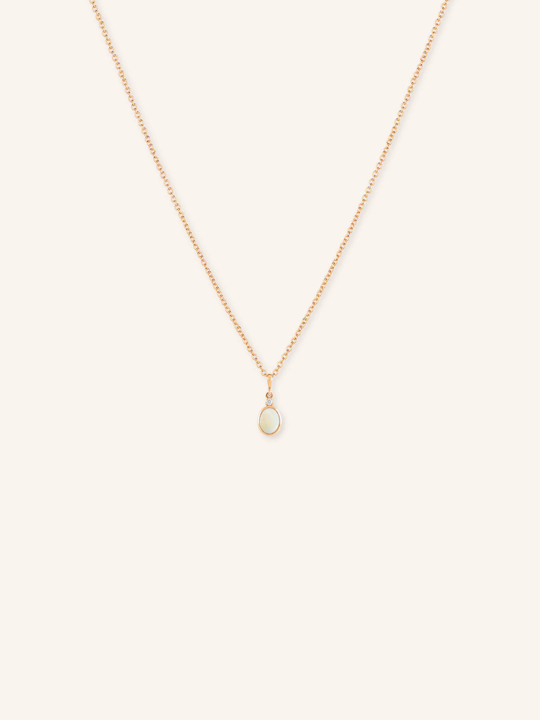 The Joyce Oval Opal Diamond Necklace exudes timeless elegance with its enchanting design. A luminous oval opal takes center stage, paired with a sparkling diamond, both securely bezel set for a sleek and modern look. This harmonious combination of vibrant opal hues and radiant diamond accents creates a captivating piece. Suspended on a fine chain, this necklace is perfect for adding a touch of refined beauty to your everyday style or special occasions.