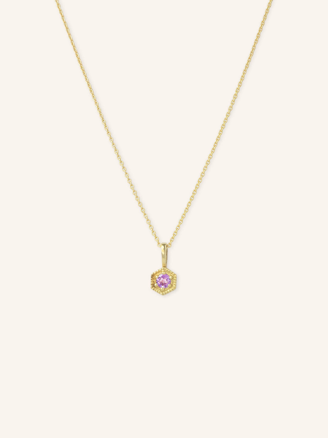 The Marigold Necklace features a beautiful hexagon shape six-prong setting with a single sparkling gemstone and delicate hand beading around the edge. This fun geometric necklace adds a unique touch to your jewelry collection, making it a versatile and eye-catching piece. Elevate your style with the Marigold Necklace, a perfect blend of modern design and timeless elegance.