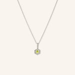 A close-up image of a woman wearing a white sapphire necklace with a gold finish and hexagon shape.