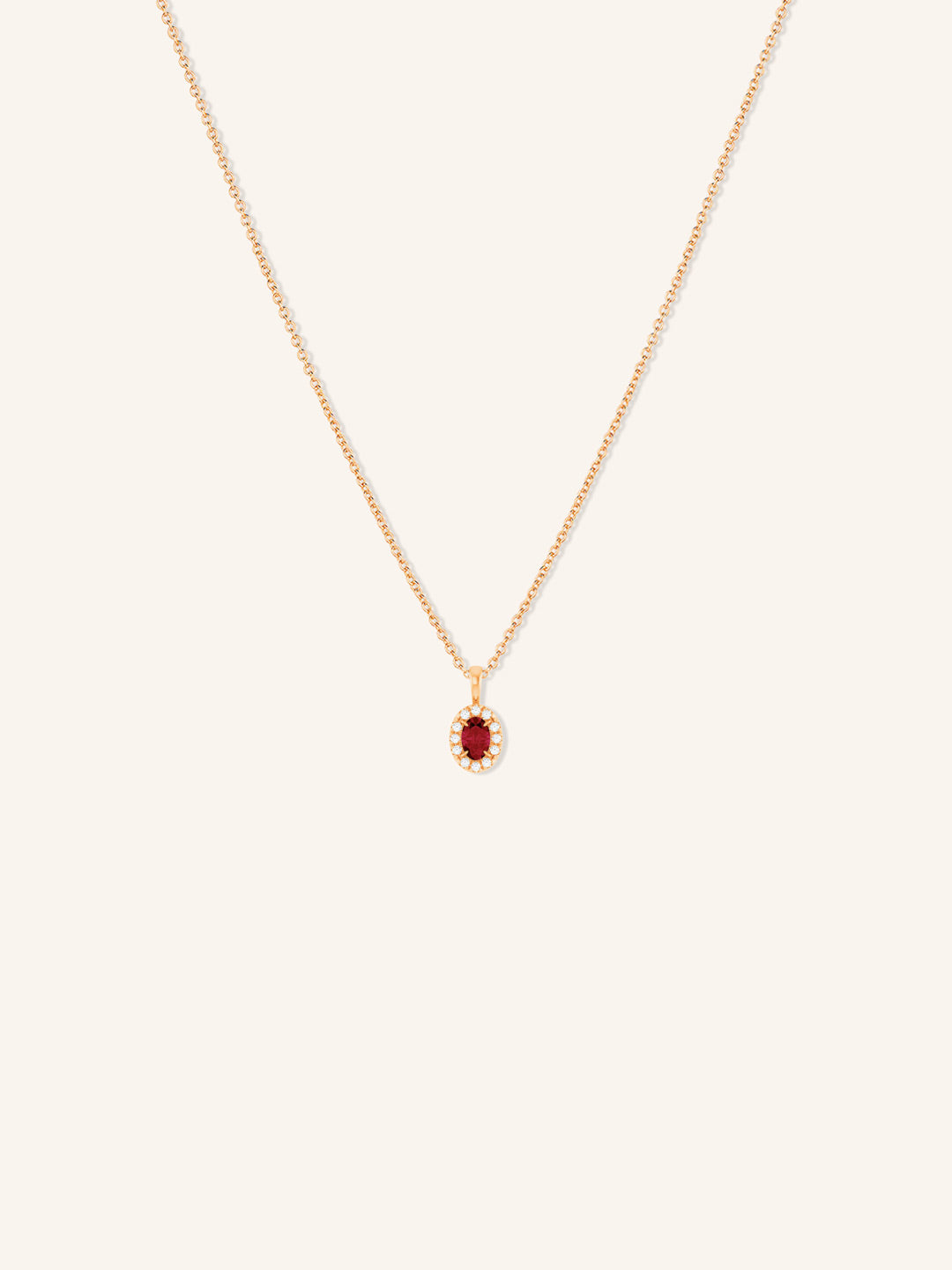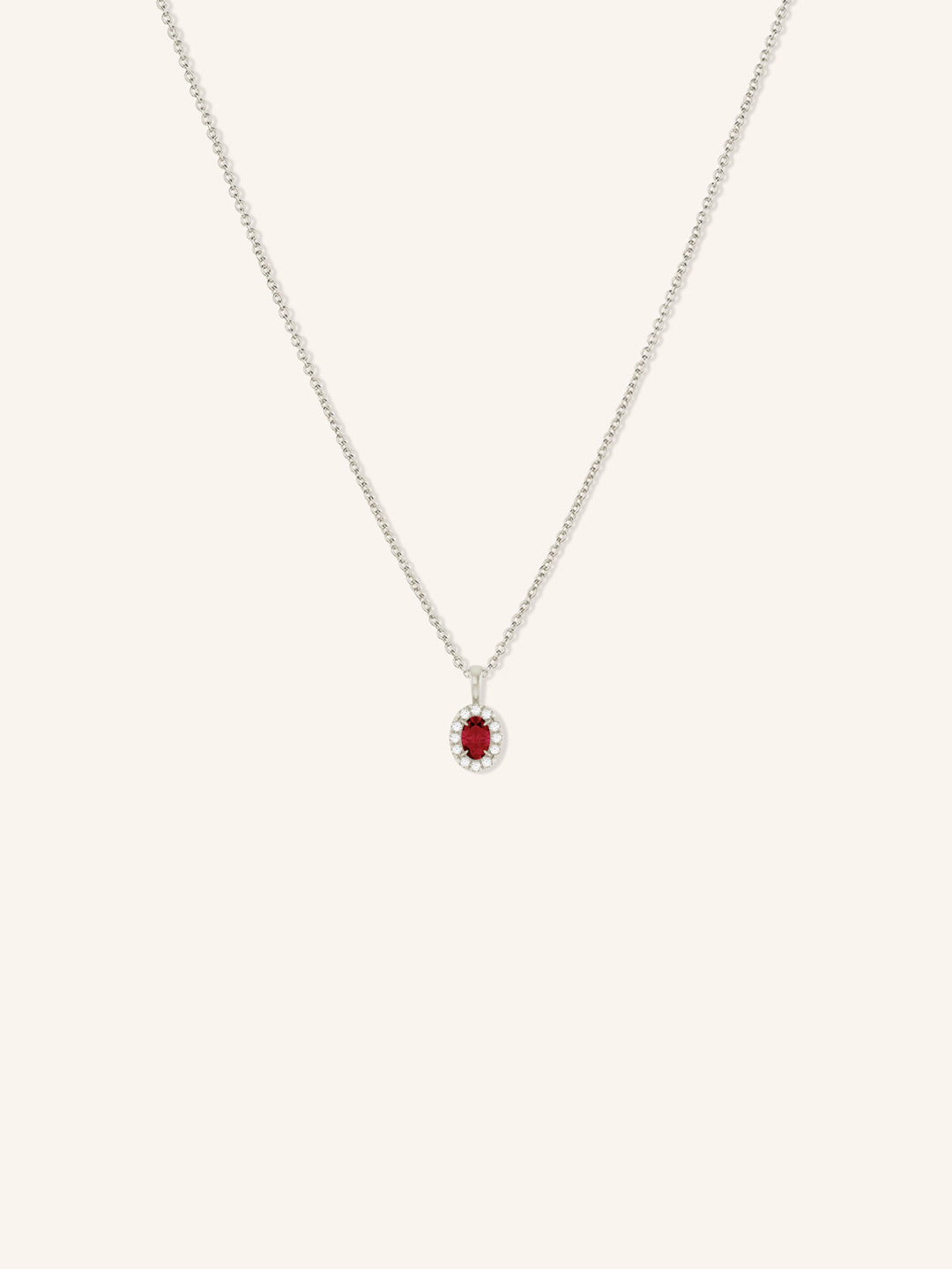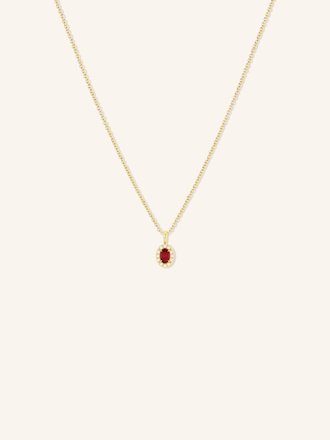 The Oval Gemstone Halo Pendant Necklace features an elegant oval gemstone encircled by a radiant halo of sparkling diamonds. Designed for timeless appeal, this pendant adds a touch of sophistication to any look.