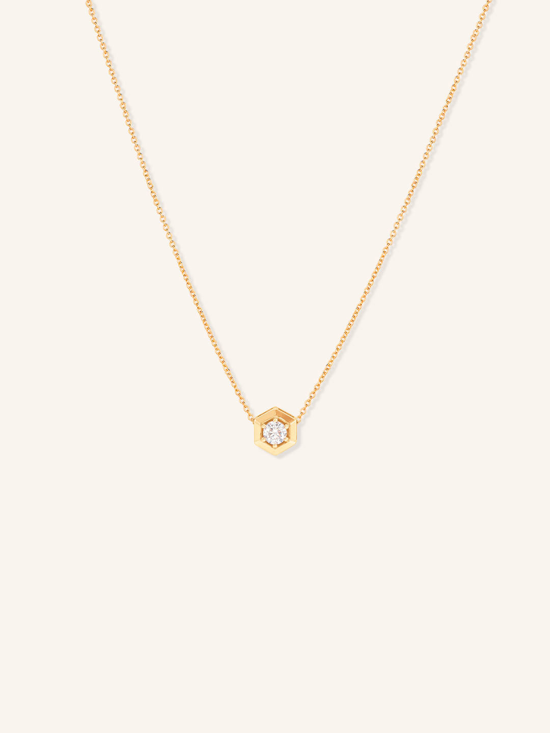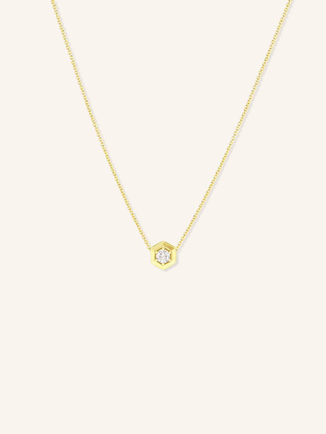A modern take on classic elegance, the Round Diamond Geometric Necklace features a brilliant round diamond set within a sleek hexagon frame. This structured yet delicate design offers a perfect balance of symmetry and sparkle, making it a versatile piece for any occasion.