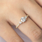 Our three stone engagement ring is a perfect combination of modern and classic design. The center stone, a stunning round-cut moissanite, is flanked by two smaller moissanites, while the side stones are set with dazzling diamonds. This exquisite ring is available in your choice of precious metal and is sure to be a cherished symbol of your love for years to come.