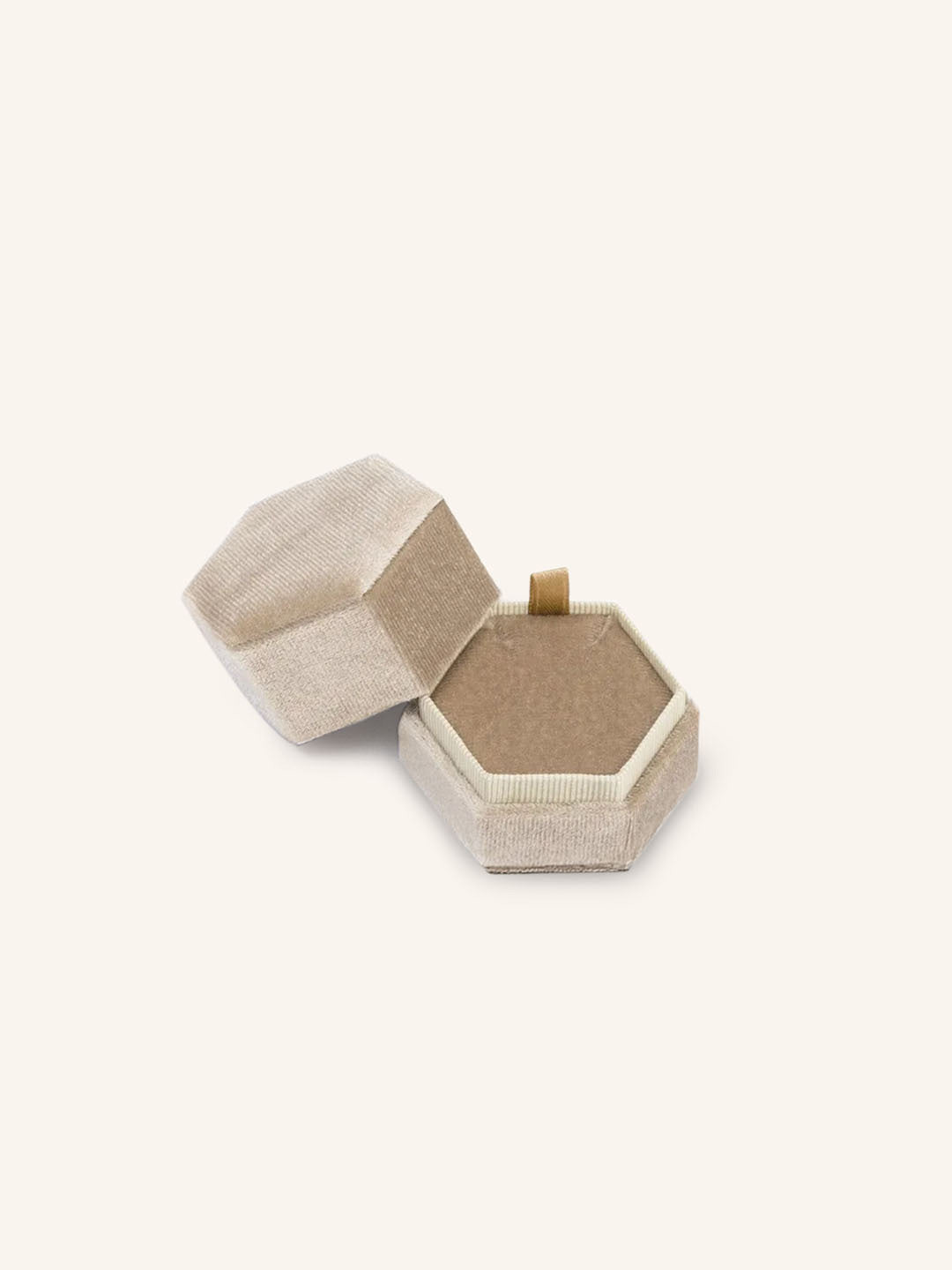 The Velvet Hexagon Pendant Box is a refined home for your most treasured necklace or pendant. Featuring a plush velvet exterior and a striking hexagon design, it offers a luxurious and unique presentation. Perfect for safekeeping or gifting, this box adds a timeless and elegant touch to any cherished piece.