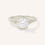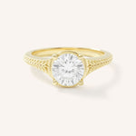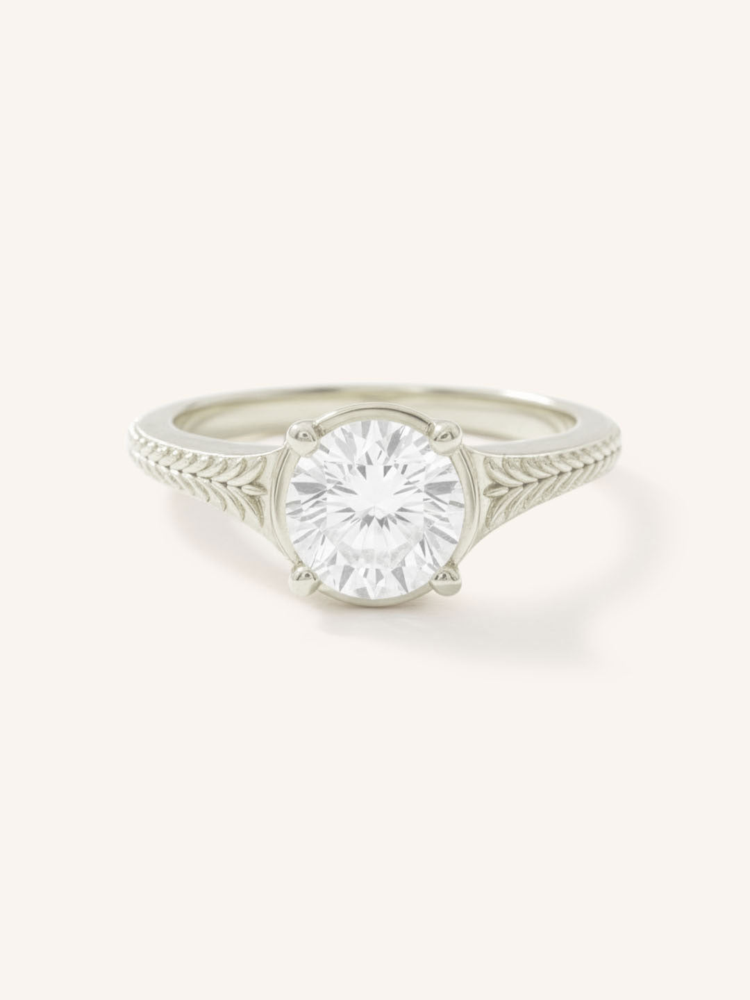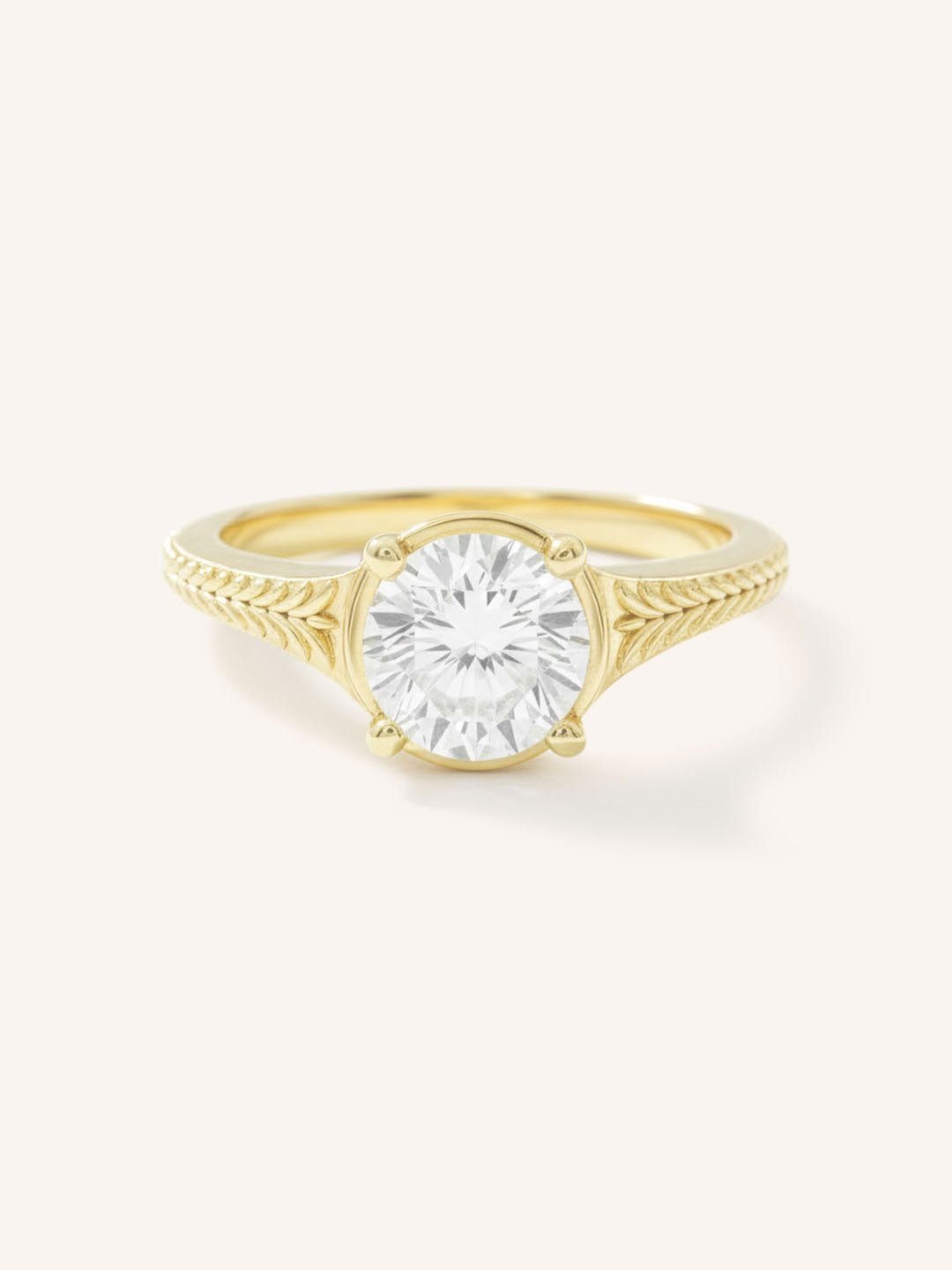 The Whera Round Diamond Solitaire Engagement Ring features a brilliant round center diamond set on a band with a delicate wheat motif pattern for a vintage-inspired touch. Handcrafted in 14k gold, its timeless design highlights the beauty of the stone while adding subtle character. A classic piece with heirloom charm and enduring elegance.